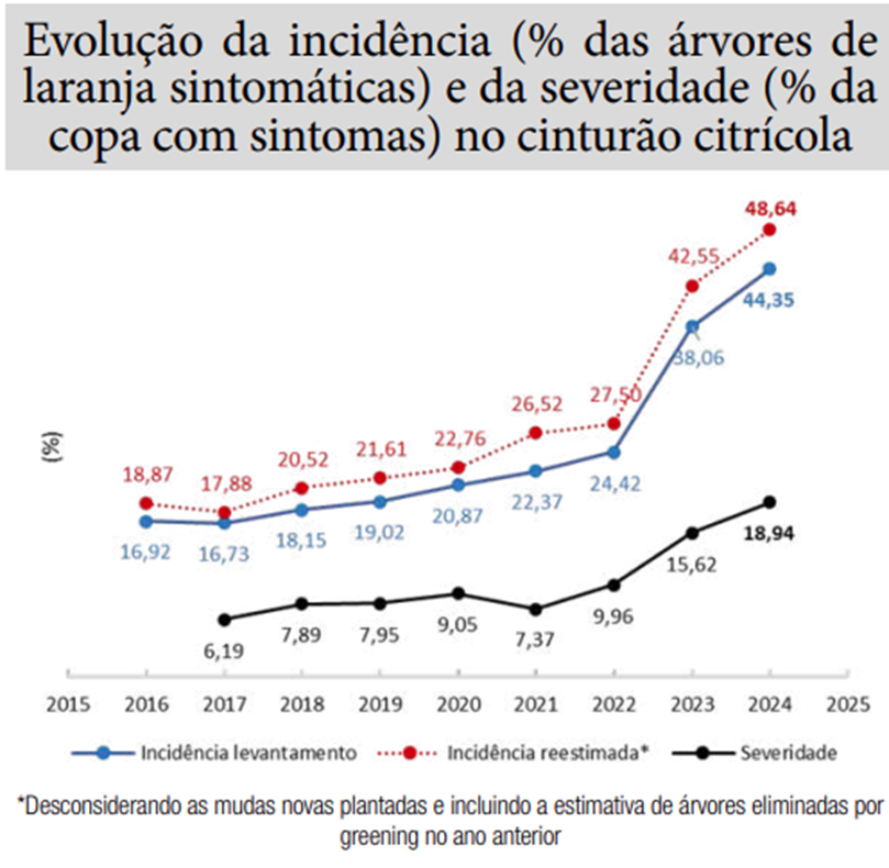 (Fonte: Levantamento_Resumo_greening_2024v2.pdf e Fundecitrus – Levantamentos –)
